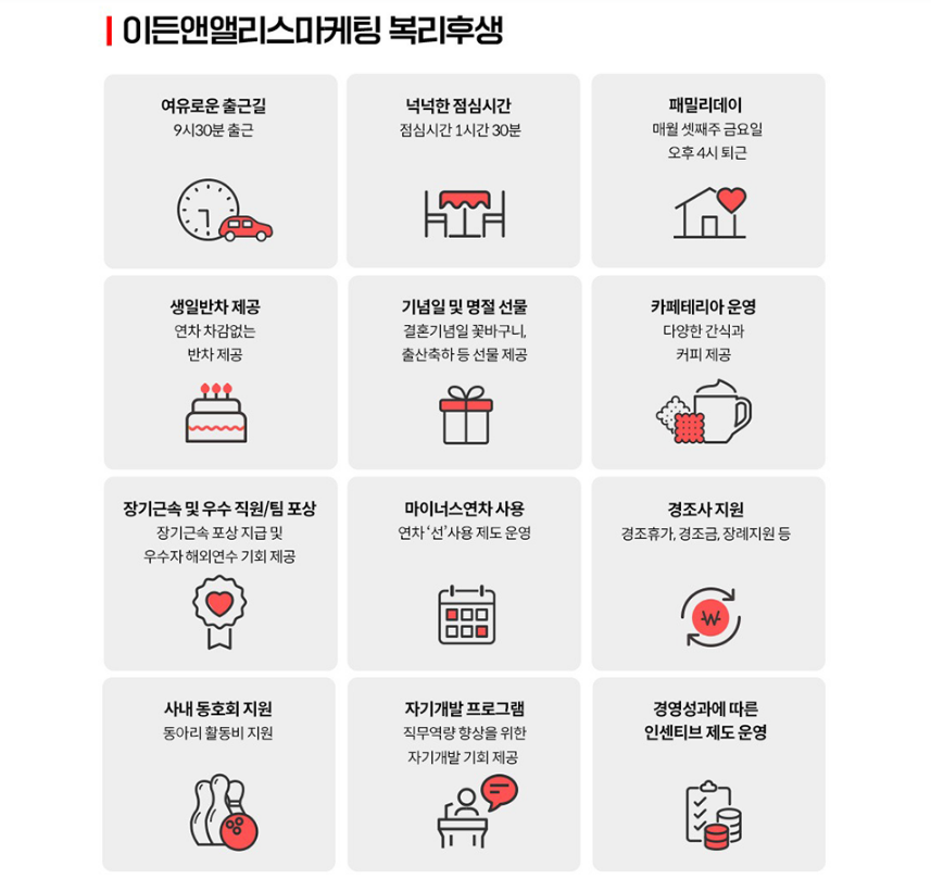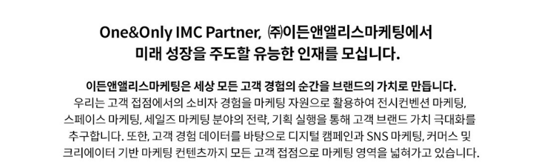 ■ 회사 홈페이지 : https://www.ethan-alice.com/ ■ 자격요건 : 기졸업(2년 이내) 및 졸업예정자 * 졸업예정자는 지원 가능하나, 입사 예정일이 5월 초입니다. 입사 후 수업 참석은 어렵고 남은 학기가 취업으로 전환이 가능한 분이면 지원 가능합니다. ■ 고용형태 및 근무사항 - 고용형태 : 정규직(수습기간 3개월) - 근무조건 : 주 5일(월~금), 09:30~18:00 - 근무예정지 : 서울시 강남구 테헤란로 도심공항타워