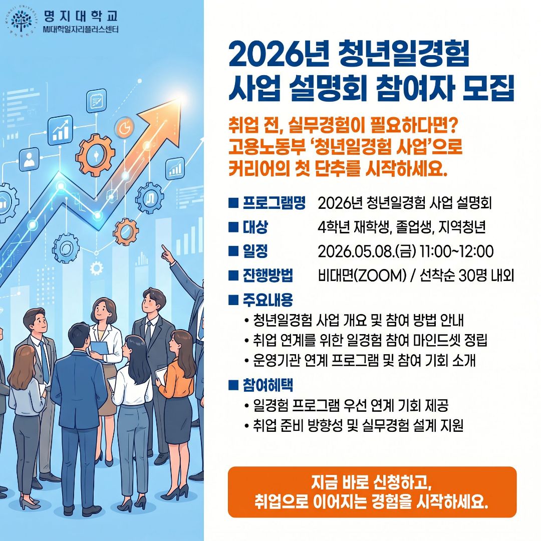 MJ대학일자리플러스센터에서는 4학년, 졸업(예정)자 및 지역청년을 대상으로 고용노동부 청년일경험(구 미래내일 일경험) 사업 안내를 통해 취업준비생의 실질적인 취업역량 강화 및 진로설계를 지원하는 설명회를 운영하고자 하오니, 취업을 준비하고 있는 청년 여러분의 많은 관심과 신청 바랍니다. 💼 2026 청년일경험 사업(인턴십 프로그램) 설명회 (비대면) 📍일시: 2026. 05. 08.(금) 11:00~11:50 📍방식: 실시간 비대면 ZOOM 📍대상: 4학년 재(휴)학생 및 졸업(예정)자, 지역청년 30명 내외(선착순) 📍신청: 네이버폼 작성 후 제출 (~05.07.(목)까지) 📍문의: 02-300-1576 (MJ대학일자리플러스센터(인문))