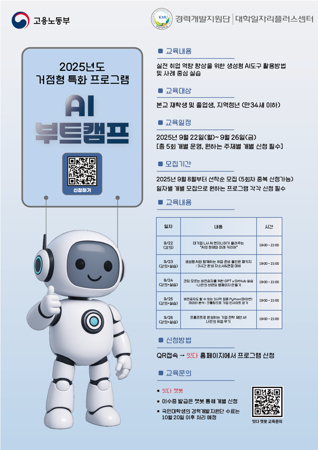 국민대학교 대학일자리플러스센터에서는 지역 청년을 대상으로 한 거점형 프로그램 2025 국민대학교 「AI 부트캠프」를다음과 같이 운영하오니 많은 관심바랍니다.