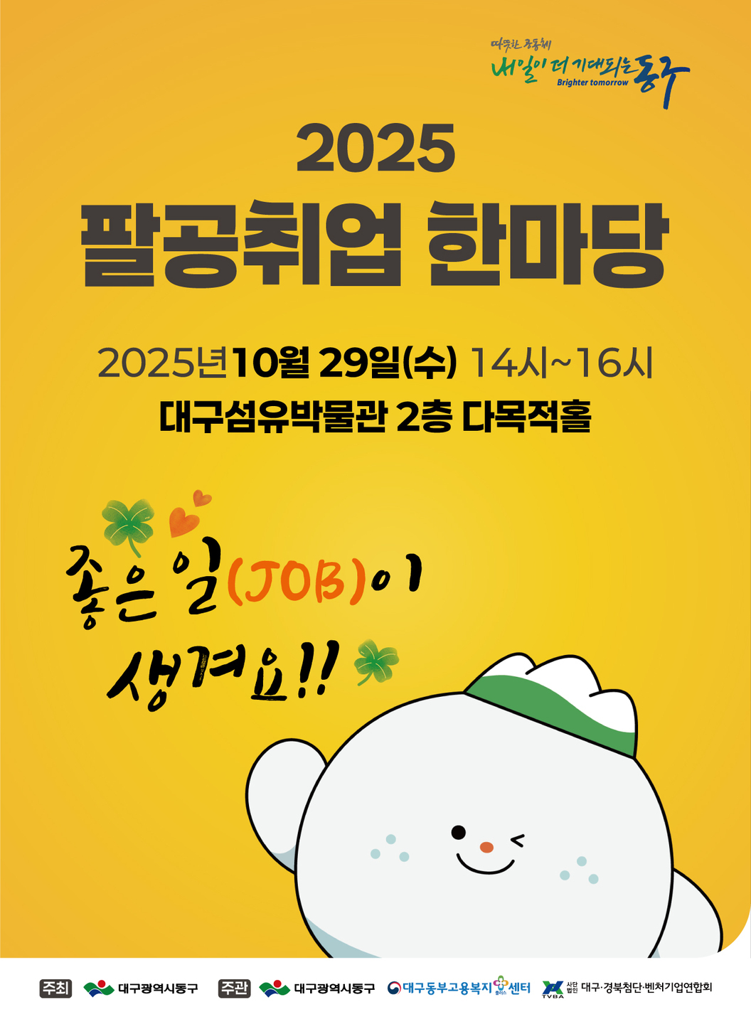 대구광역시 동구에서는 지역경제 활성화 및 고용촉진을 위하여 구인·구직 만남의 행사인 「2025년 팔공취업한마당」을 아래와 같이 개최하오니, 많은 구직자들이 참여 바랍니다. ◎ 행사 개요 - 행 사 명 : 2025 팔공취업한마당 - 일 시 : 2025. 10. 29.(수) 14:00 ~ 16:00 - 장 소 : 대구섬유박물관(2층 다목적홀) - 내 용 : 채용면접, 취업지원, 부대행사 등 - 규 모 : 참여기업 25개사, 참여인원 300여명