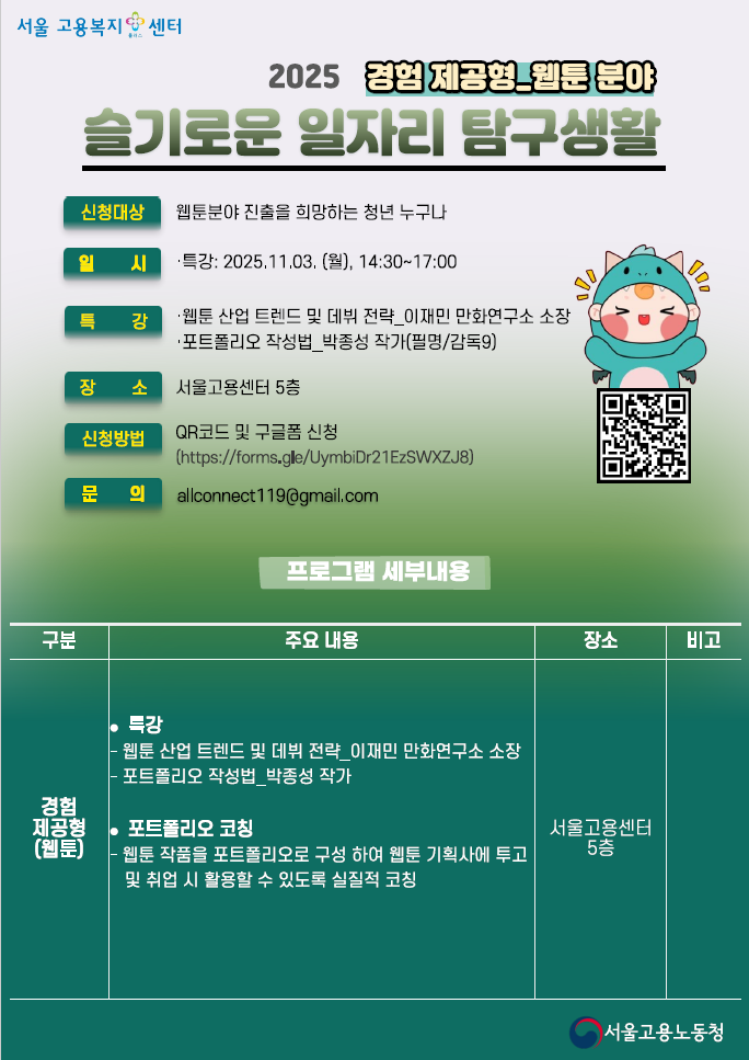 | [서울고용센터] 슬기로운 일자리 탐구생활_경험제공형 웹툰분야 참여자 모집 | 이지우 / 2025.10.24 | |