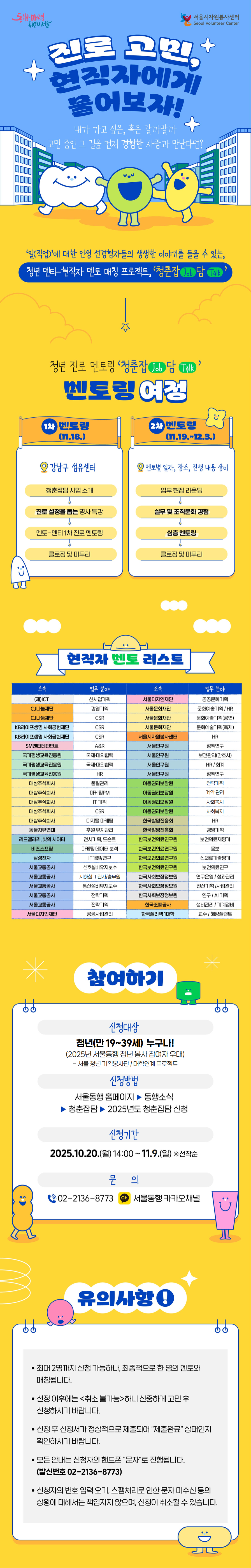 | [서울시자원봉사센터] 2025년 현직자 진로 멘토링 '청춘잡담' 모집 | 이지우 / 2025.11.06 | |