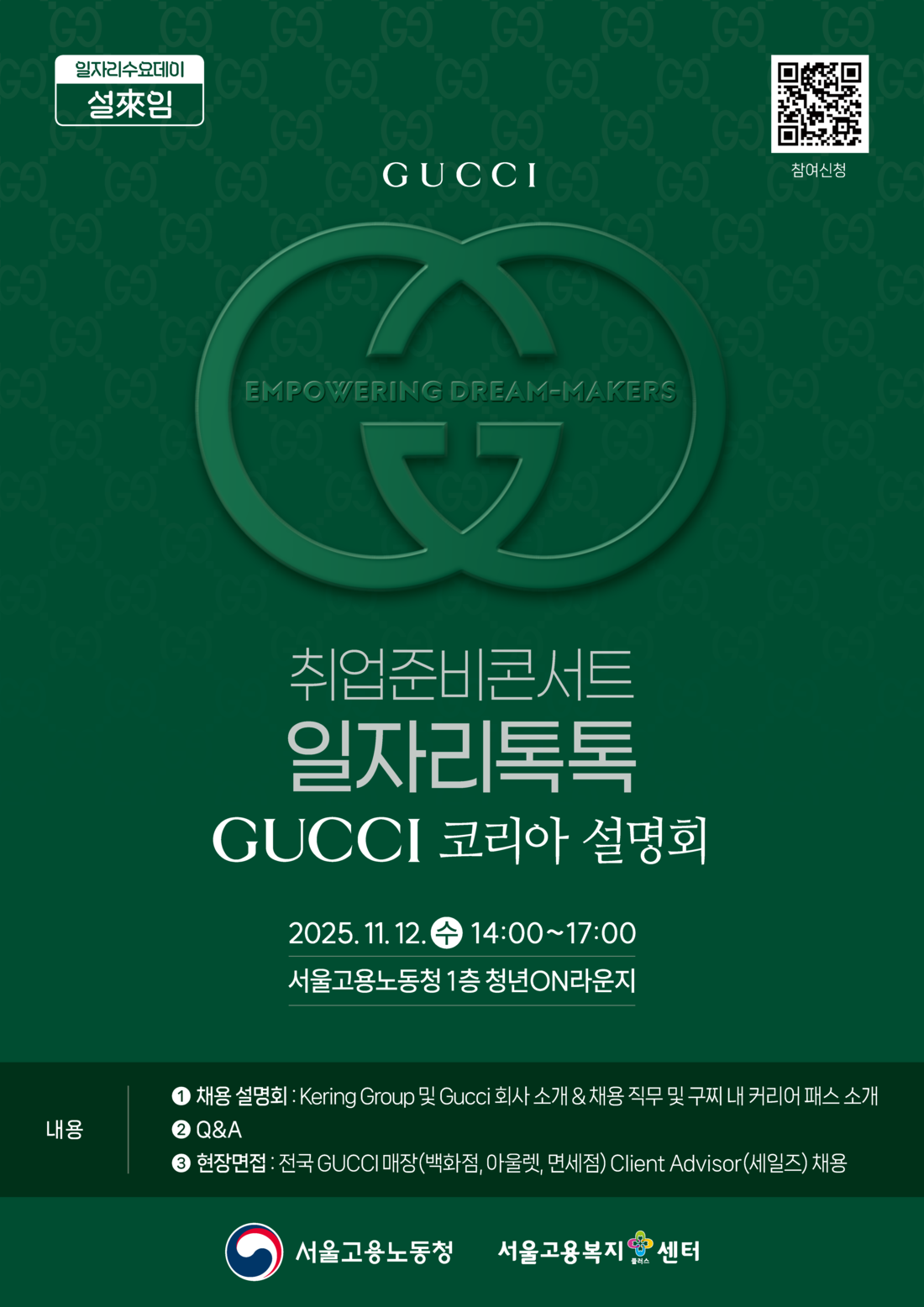| [서울고용노동청] GUCCI코리아 취업준비콘서트_일자리톡톡 | 이지우 / 2025.11.06 | |