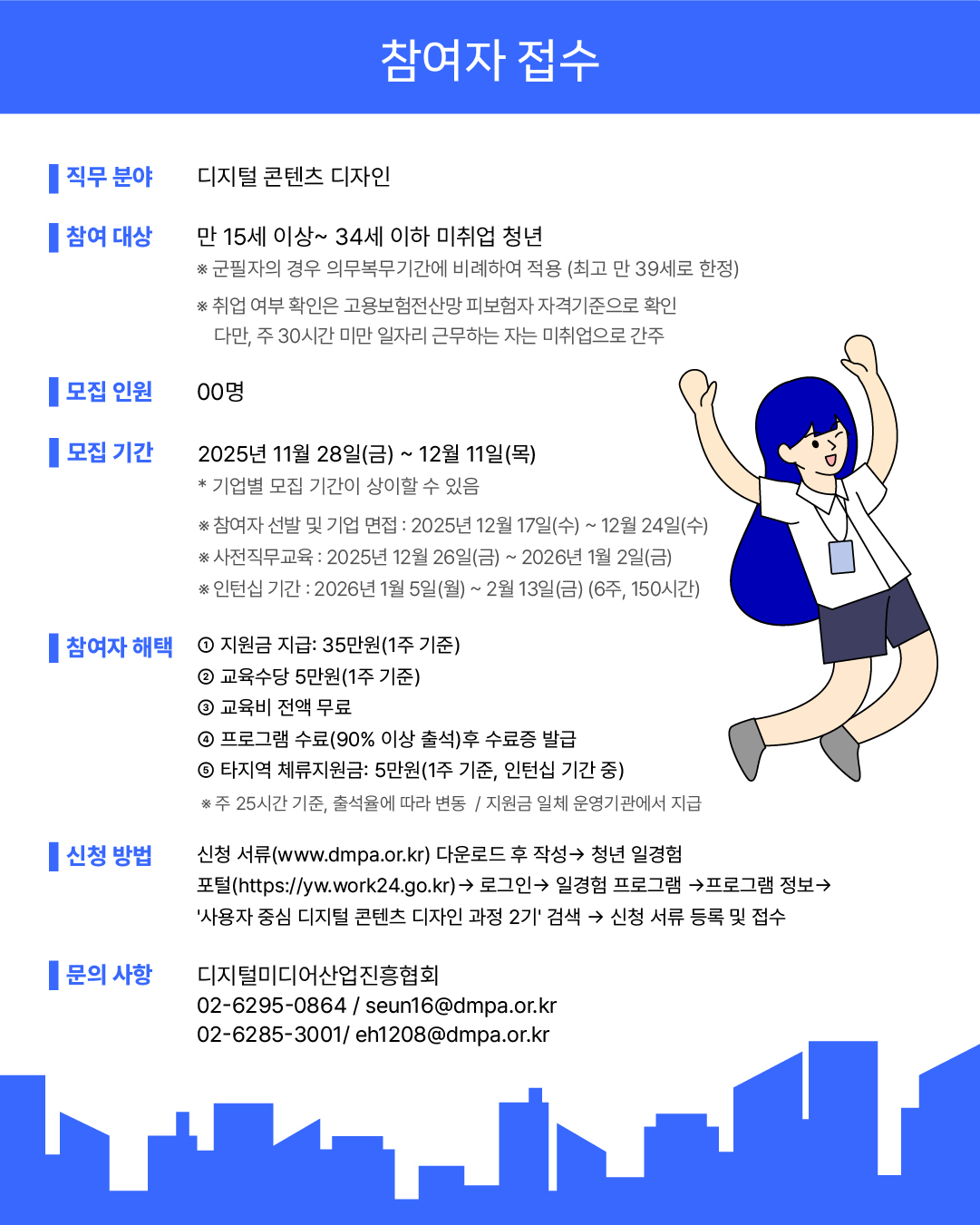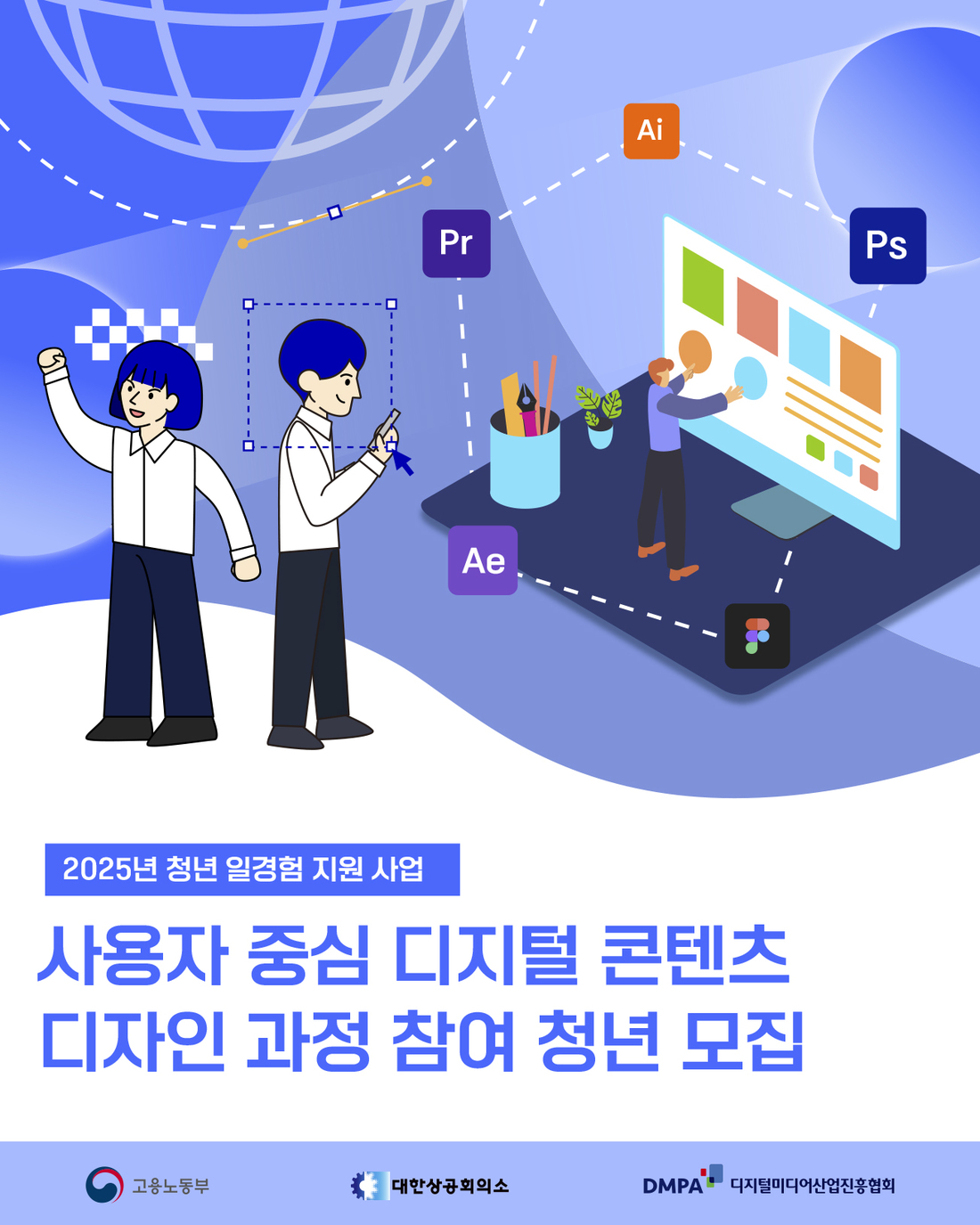 (사)디지털미디어산업진흥협회는 고용노동부와 대한상공회의소가 공동으로 주관하는 「2025년 청년 일경험 지원사업」의 일환으로, 디지털 콘텐츠 디자인 분야에 관심 있는 청년을 대상으로 한 ‘사용자 중심 디지털 콘텐츠 디자인 과정 4기’를 운영하고 있습니다. 본 과정은 청년 미취업자에게 실무 중심의 디자인 교육과 더불어, 기업 인턴십을 연계한 일경험 기회를 제공하여 디지털 산업 분야의 실질적인 취업 연계 및 역량 강화를 목적으로 기획되었습니다.