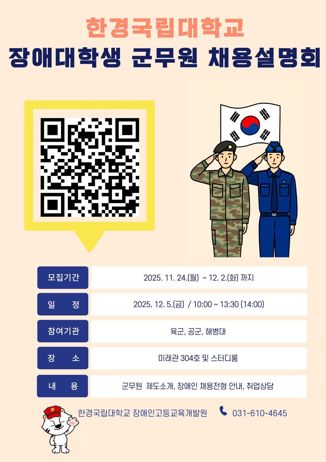 한경국립대학교는「2025년 장애학생 지원 권역별 선도대학(통합지원유형교)」으로 장애대학생을 대상으로 다양한 프로그램을 운영하고 있습니다. 군무원 장애인 채용정보에 대한 접근성을 향상시키고 장애대학생의 공공부문 취업 기회를 확대하기 위한 「장애대학생 대상 군무원 채용 설명회」를 아래와 같이 실시하오니 많은 관심바랍니다. 가. 추진일정: 2025.12.5.(금) 10:00 ~ 13:30 나. 추진장소: 한경국립대학교 평택캠퍼스 미래관 304호(대강당) 및 스터디룸 3개소 다. 운영대상: 전국대학교 장애학생 ※목표 20명 라. 신청방법: 자기기입식 구글폼 신청서*작성(포스터 QR코드 활용) *URL주소: https://forms.gle/oPRTdKps2Ya9Q3tv7 마. 신청기간: 2025.12.2.(화)까지 바. 주요내용: 군무원 제도 소개, 장애인 채용전형 안내, 취업 상담 진행 등